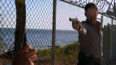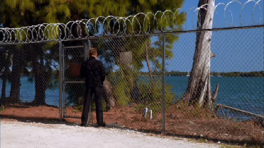 Then we see Michael regain focus on Anson and go after him as he leaves on a boat. This was filmed on location at the Miami Seaquarrium 80 yards east of where we saw Anson cutting through the chain.