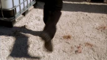 As Michael runs outside to check on things we see the factory in the background as he runs across the grass lawn. However, it then cuts and he is magically running across bare coral. The filming location has clearly changed.