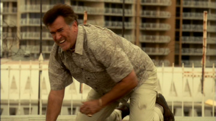 Our gang breaches the roof to escape. Only, as we see them climb onto the roof we see they are no longer at the Miami Woman’s Club. They have relocated to another famous and readily recognizable Miami Vice location. The rooftop of the Mayfair Hotel as seen in French Twist. The unique structure seen in the background on the roof is where we see Bandi call into the OCB.