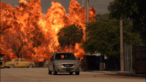 The chase is on, we see the van pull from westbound on NW 22nd Street onto NW 5th Avenue headed north. Wynwood Village is seen in the background, where they filmed the jump sequence over the alley.