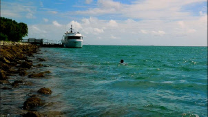 Michael dives into the Cape Florida water with Stiltsville in the background.