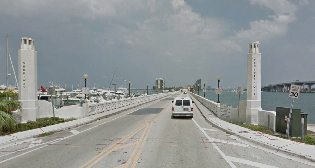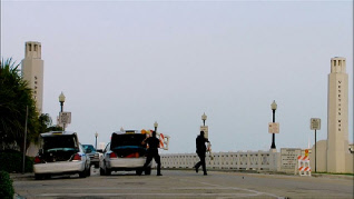 They enter onto the Venetian Causeway. As they approach, the Omni is partially seen in the background.