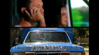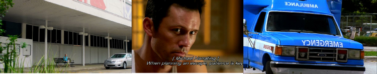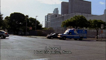 Then back to the ambulance. This was filmed on location on Oak Avenue picking up where it cut earlier on Oak Ave. Headed eastbound across Virginia Street. Mayfair Villas is seen in the background. We saw this same route traveled in episode 44, Devil You Know, where Michael chased Simon through here.