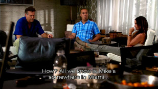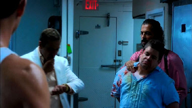 While there they get a call from Schmidt. He went to the warehouse where now he is in trouble. Filming location unknown.